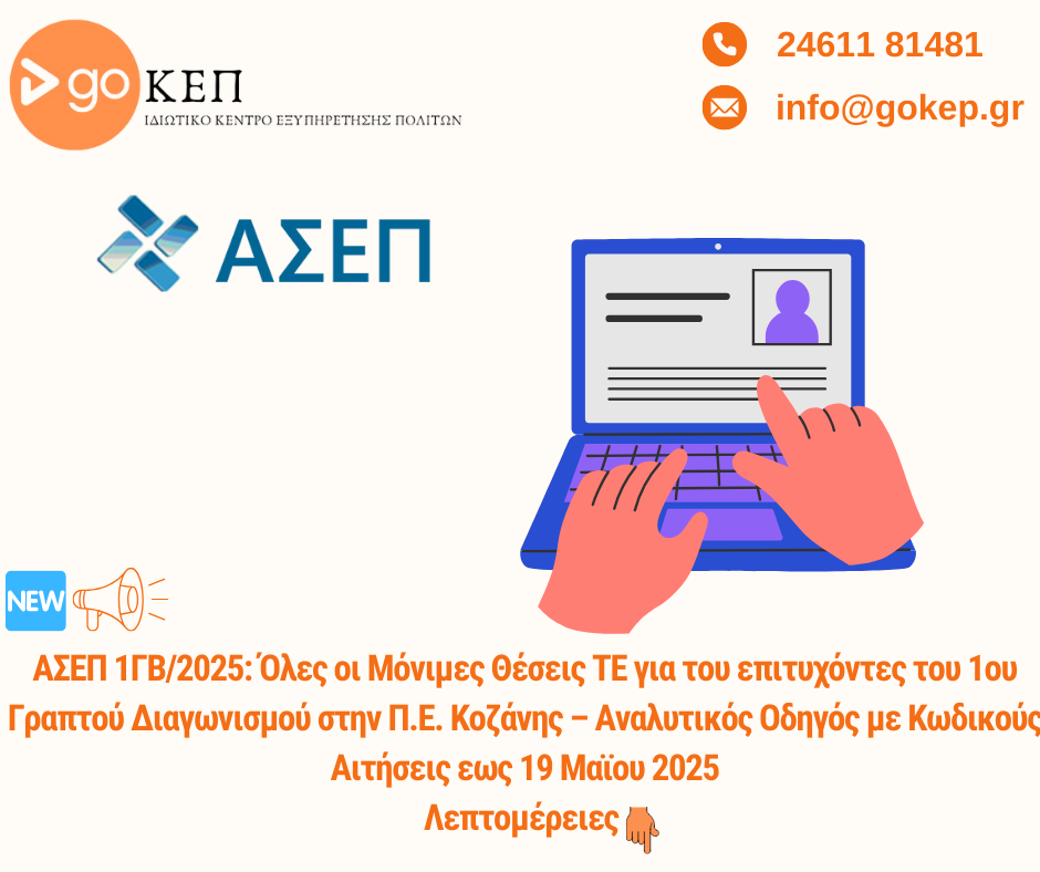 Η νέα μεγάλη προκήρυξη του ΑΣΕΠ (1ΓΒ/2025) φέρνει 2.084 μόνιμες προσλήψεις στον δημόσιο τομέα, με σημαντικό αριθμό θέσεων και για την Περιφερειακή Ενότητα Κοζάνης. Αναφέρεται αποκλειστικά για του επιτυχόντες του 1ου Γραπτού Διαγωνισμού. Εδώ στο GOΚΕΠ, είμαστε έτοιμοι να αναλάβουμε όλη τη διαδικασία για λογαριασμό σας, εξασφαλίζοντας τη σωστή και έγκαιρη υποβολή της αίτησής σας!