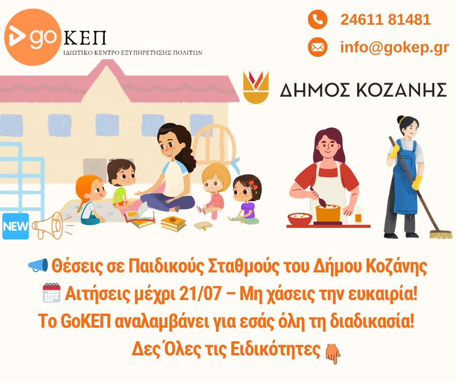 Ο Δήμος Κοζάνης προκηρύσσει 30 θέσεις εργασίας με σύμβαση ορισμένου χρόνου για την κάλυψη αναγκών σε Δημοτικούς Παιδικούς και Βρεφονηπιακούς Σταθμούς.