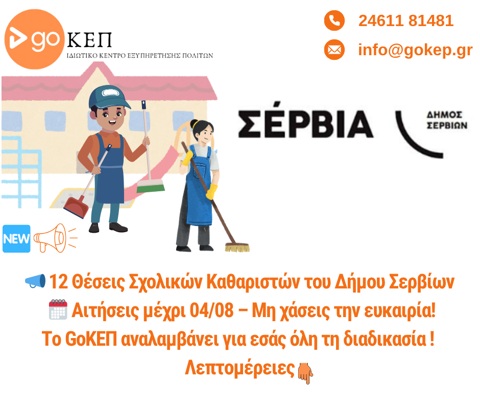 Ο Δήμος Σερβίων ανακοίνωσε την έναρξη υποβολής αιτήσεων για την πρόσληψη καθαριστών/καθαριστριών σχολικών μονάδων για το σχολικό έτος 2025-2026.