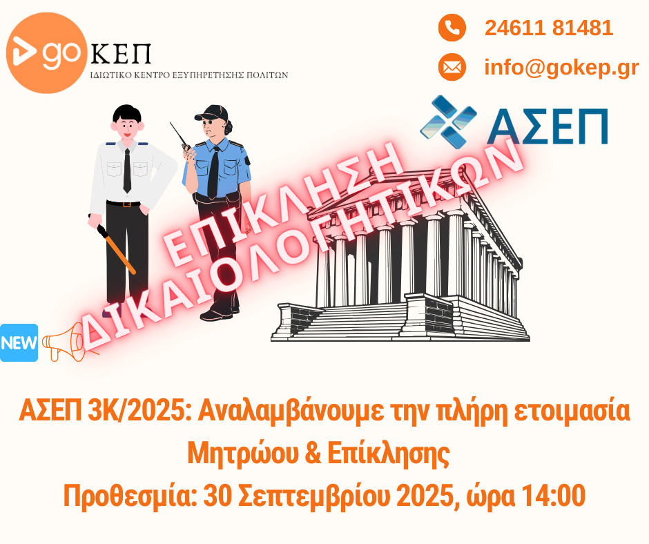 ✅ Είμαστε το GoΚΕΠ — Ιδιωτικό Κέντρο Εξυπηρέτησης Πολιτών, με εμπειρία στην προετοιμασία φακέλων για ΑΣΕΠ.