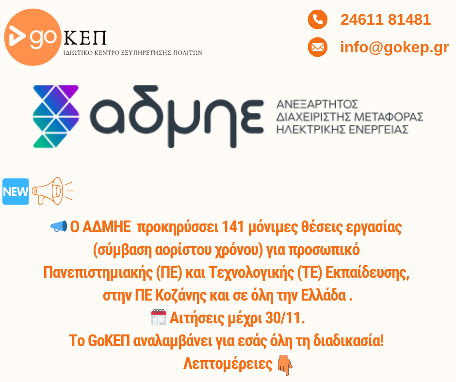 Ο ΑΔΜΗΕ (Ανεξάρτητος Διαχειριστής Μεταφοράς Ηλεκτρικής Ενέργειας) προκηρύσσει 141 μόνιμες θέσεις εργασίας (σύμβαση αορίστου χρόνου) για προσωπικό Πανεπιστημιακής (ΠΕ) και Τεχνολογικής (ΤΕ) Εκπαίδευσης, σε όλη την Ελλάδα.