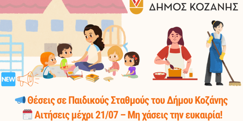 Ο Δήμος Κοζάνης προκηρύσσει 30 θέσεις εργασίας με σύμβαση ορισμένου χρόνου για την κάλυψη αναγκών σε Δημοτικούς Παιδικούς και Βρεφονηπιακούς […]