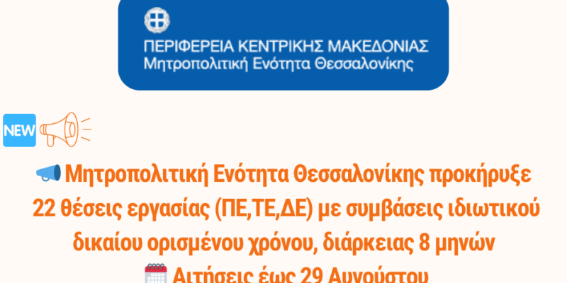 Μητροπολιτική Ενότητα Θεσσαλονίκης προκήρυξε 22 θέσεις εργασίας (ΠΕ,ΤΕ,ΔΕ) με συμβάσεις ιδιωτικού δικαίου ορισμένου χρόνου, διάρκειας 8 μηνών